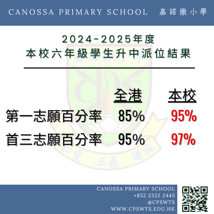 本校97%學生獲派首三志願,52%學生入讀以英語為主要授課語言中學,